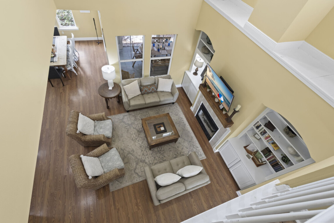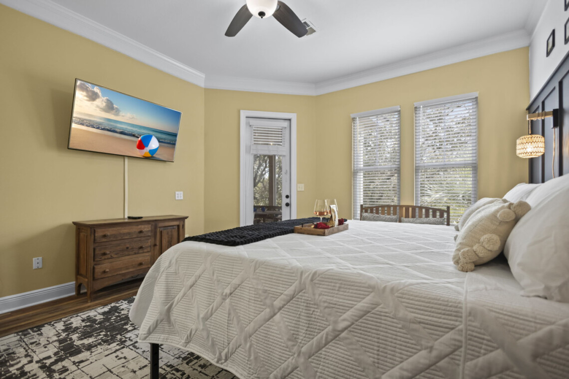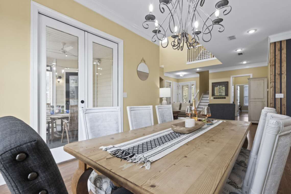 The home features 4 spacious bedrooms, including 2 king suites on the main level and a charming Crow’s Nest, providing ample space for up to 13 guests. The open-concept living room, dining room, and kitchen allow for easy entertaining and gatherings. The house has been recently updated and offers 9 ft ceilings across 3 levels, providing a spacious and inviting atmosphere.