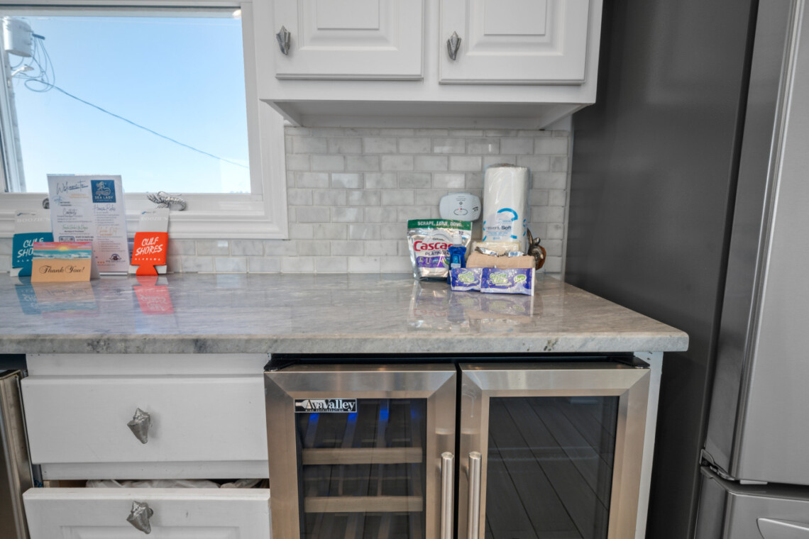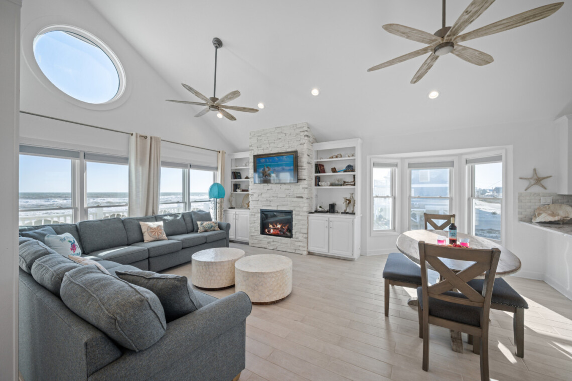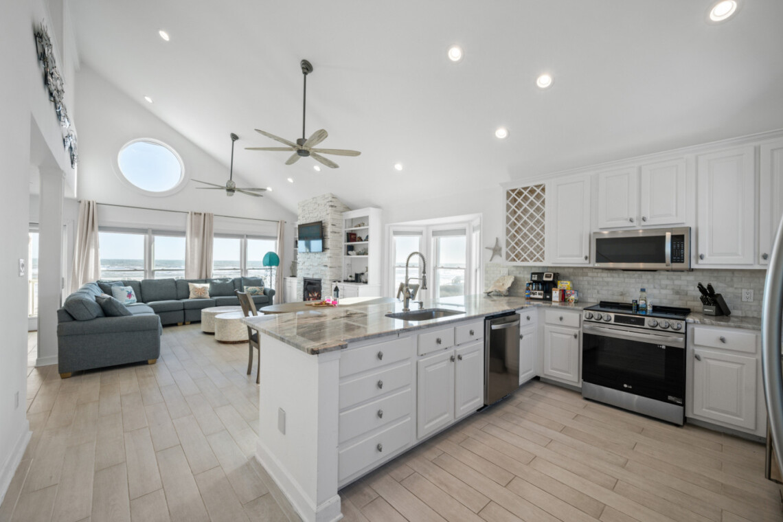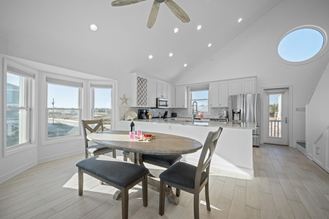Sea Lady’s gourmet kitchen is a chef’s dream, boasting high-end appliances, wine fridge, quartz countertops, and a spacious island for gathering. Dine indoors with panoramic beach views, or step onto the beachfront deck for alfresco dining under the stars.
