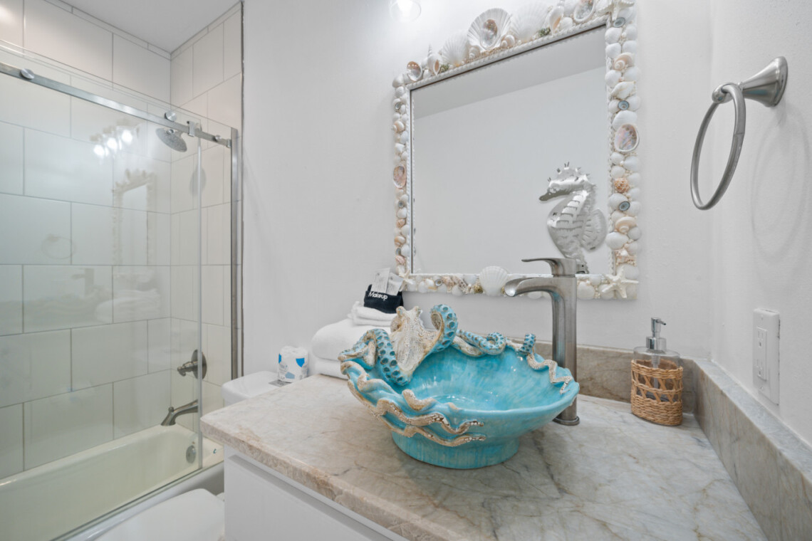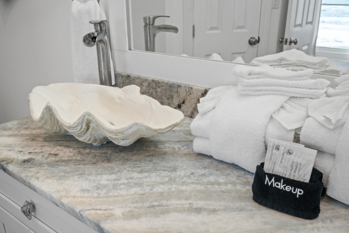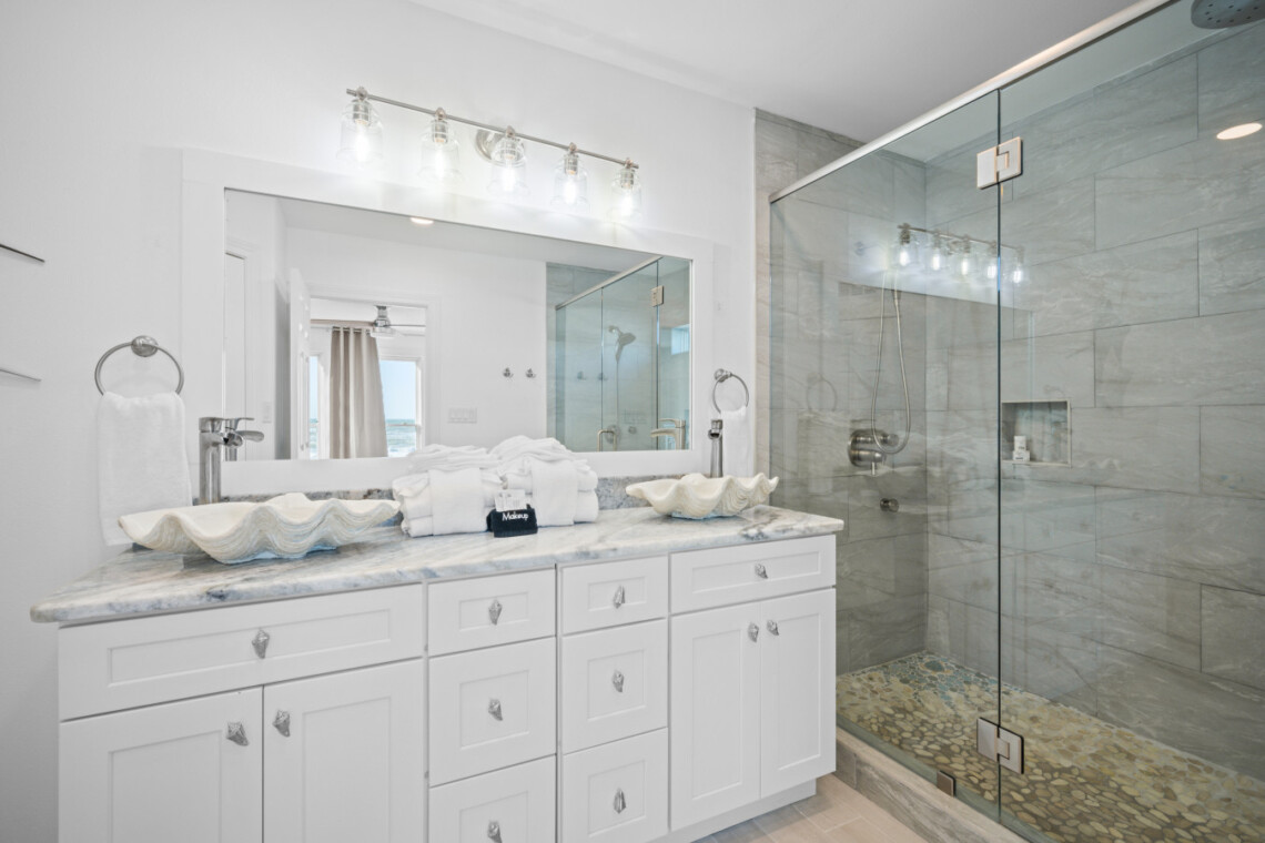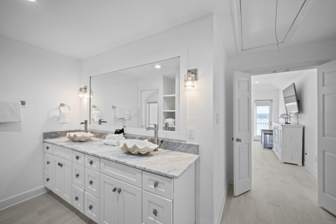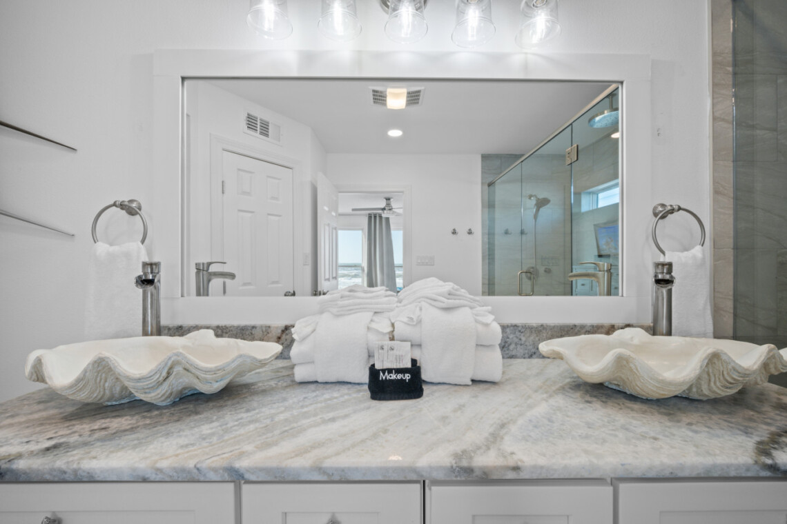 Sea Lady’s gourmet kitchen is a chef’s dream, boasting high-end appliances, wine fridge, quartz countertops, and a spacious island for gathering. Dine indoors with panoramic beach views, or step onto the beachfront deck for alfresco dining under the stars.
