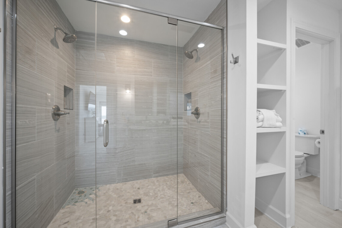 Each of the 3 designer bedrooms offers a peaceful sanctuary, with high-end furnishings and sumptuous bedding. the house boosts 2 master suites. The primary suite is on the main level is a true indulgence, featuring a private balcony, king-size bed, and a spa-like en-suite bathroom rain shower and luxe finishes. Upstairs the second master features the same as the primary including a walk-out deck. The final bedroom provides equally inviting space ensuring every guest enjoys comfort and style.