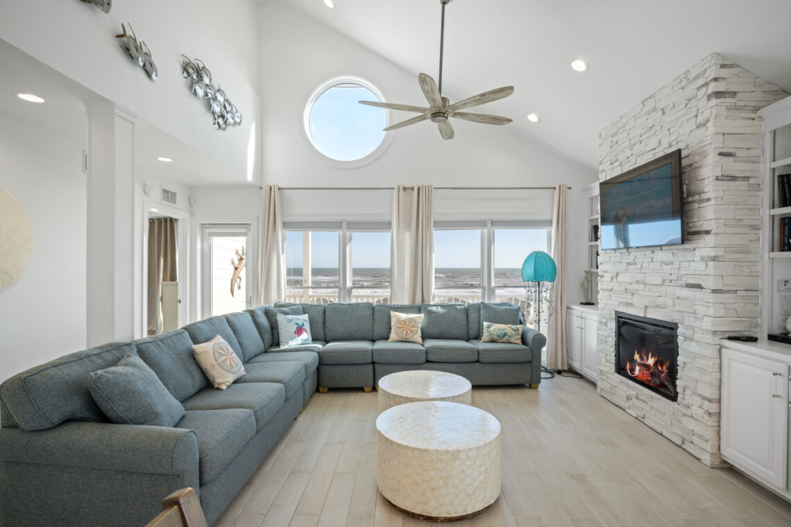Step inside to elegant coastal interiors, where expansive windows frame the endless gulf front views. The open-concept living, dining, & kitchen area invites you to relax in sophisticated comfort, with plush seating, curated décor, and glass doors leading to a gulf-front deck—perfect for morning coffee or sunset cocktails.