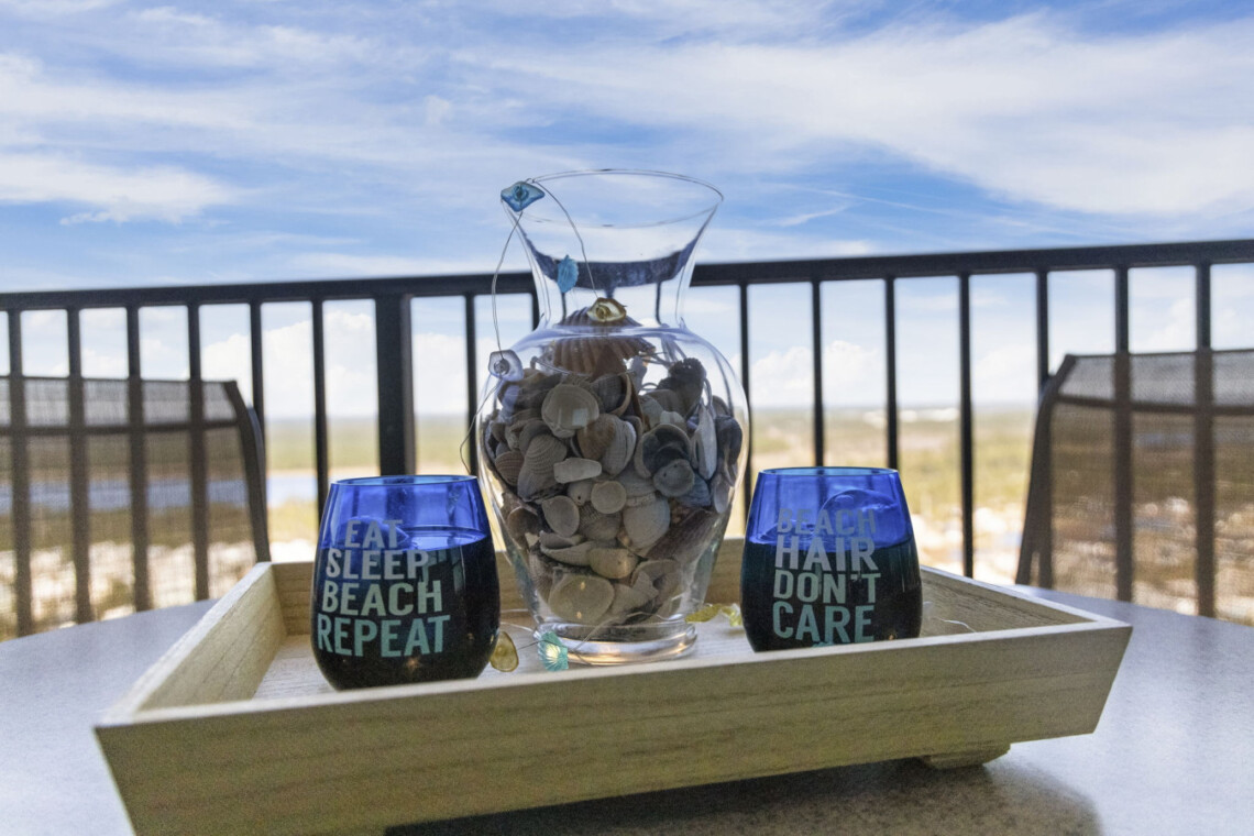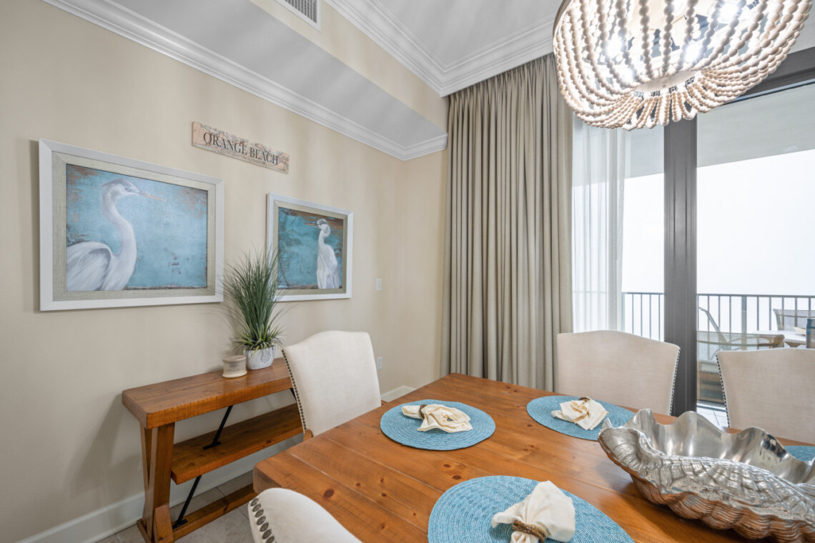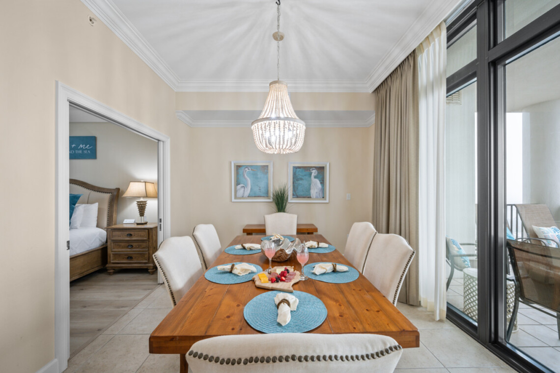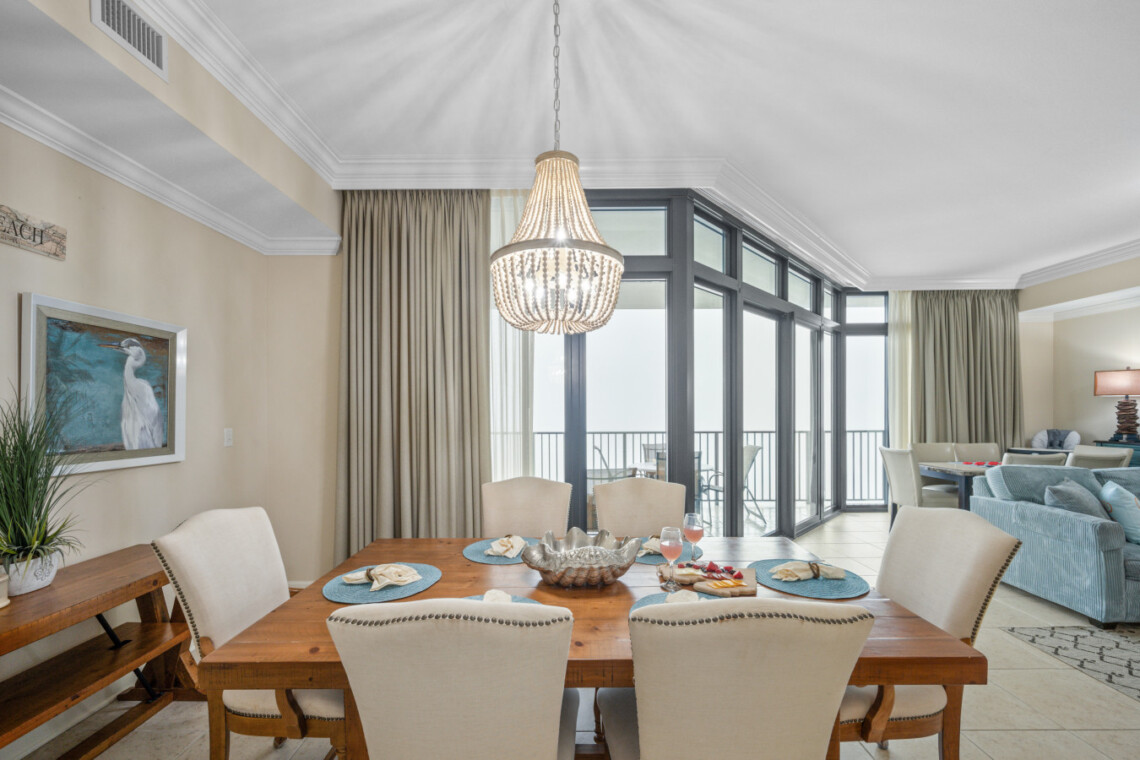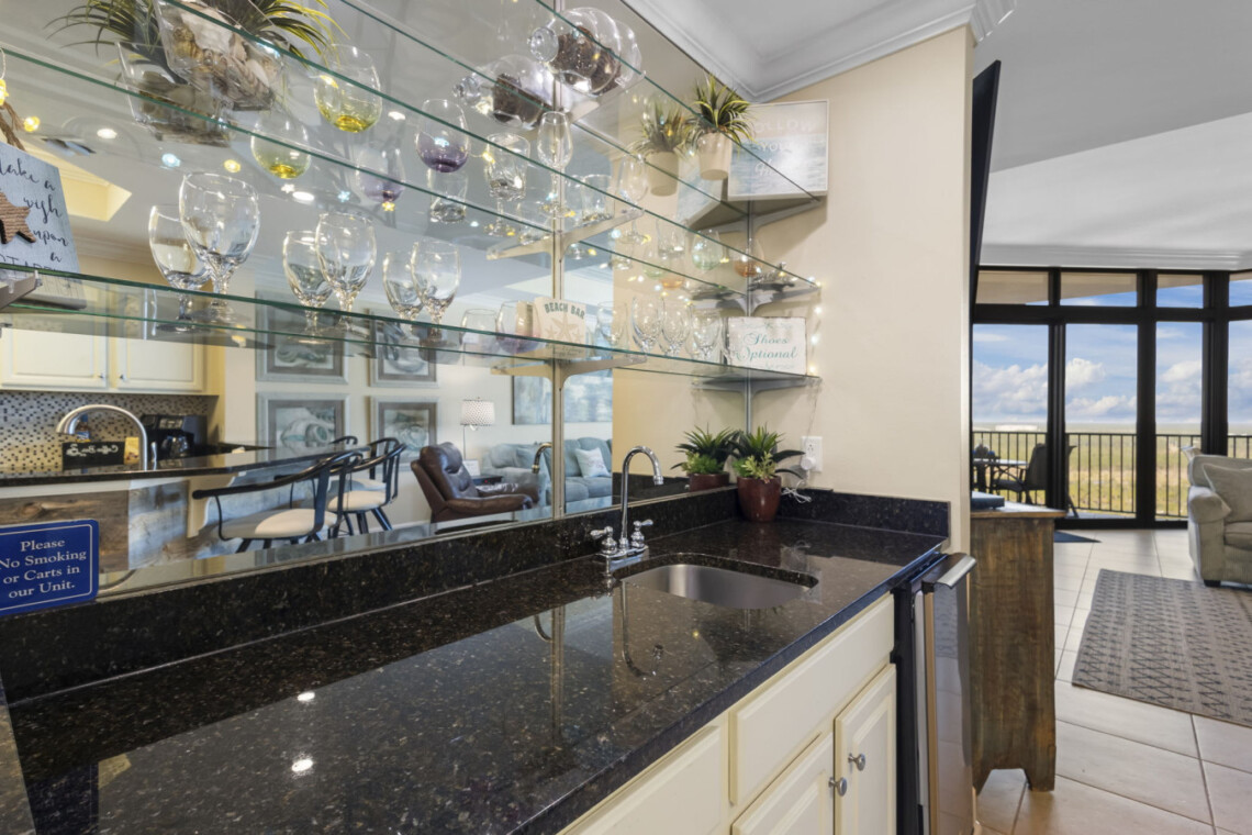 The wet bar adds an extra touch of convenience with its sink, ice maker, blender, and glassware—perfect for prepping sunset drinks to enjoy on your expansive balcony for alfresco dining or simply unwind as the sun sets over the lagoon horizon. Seating for 8 allows everyone to take in the stunning panoramic views of the Gulf State Park and main strip of Orange Beach,