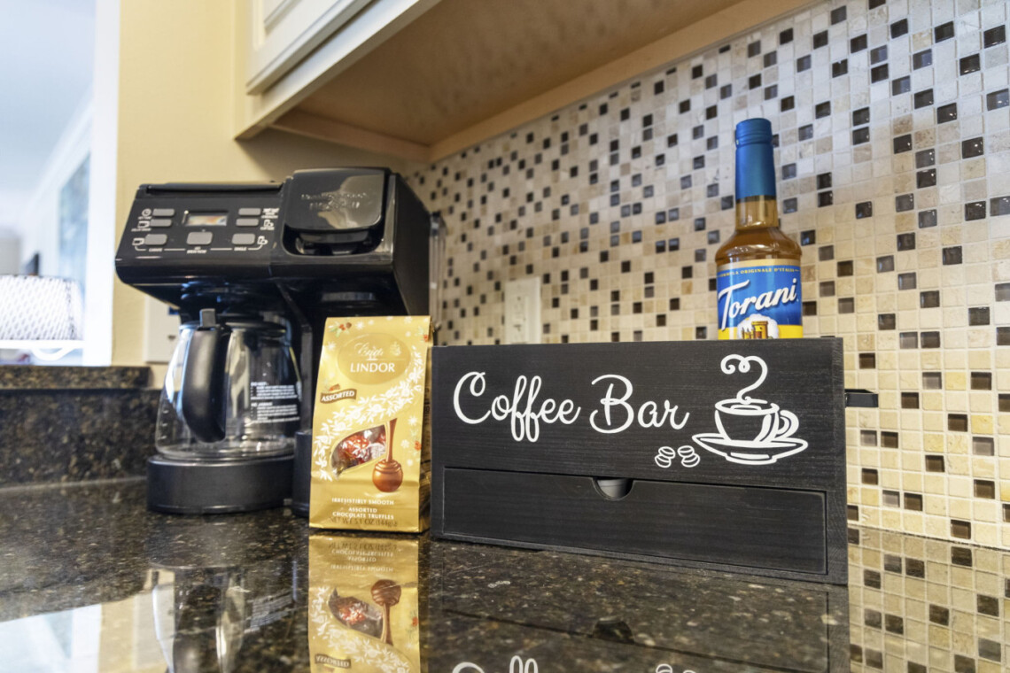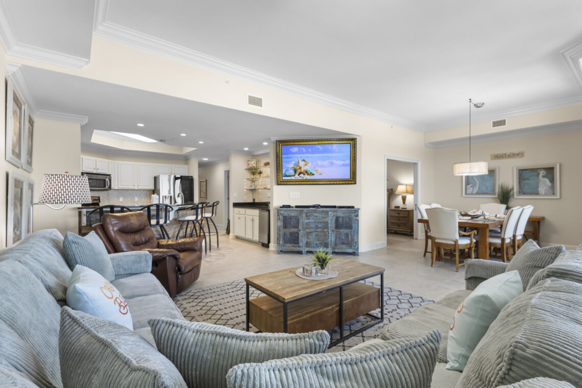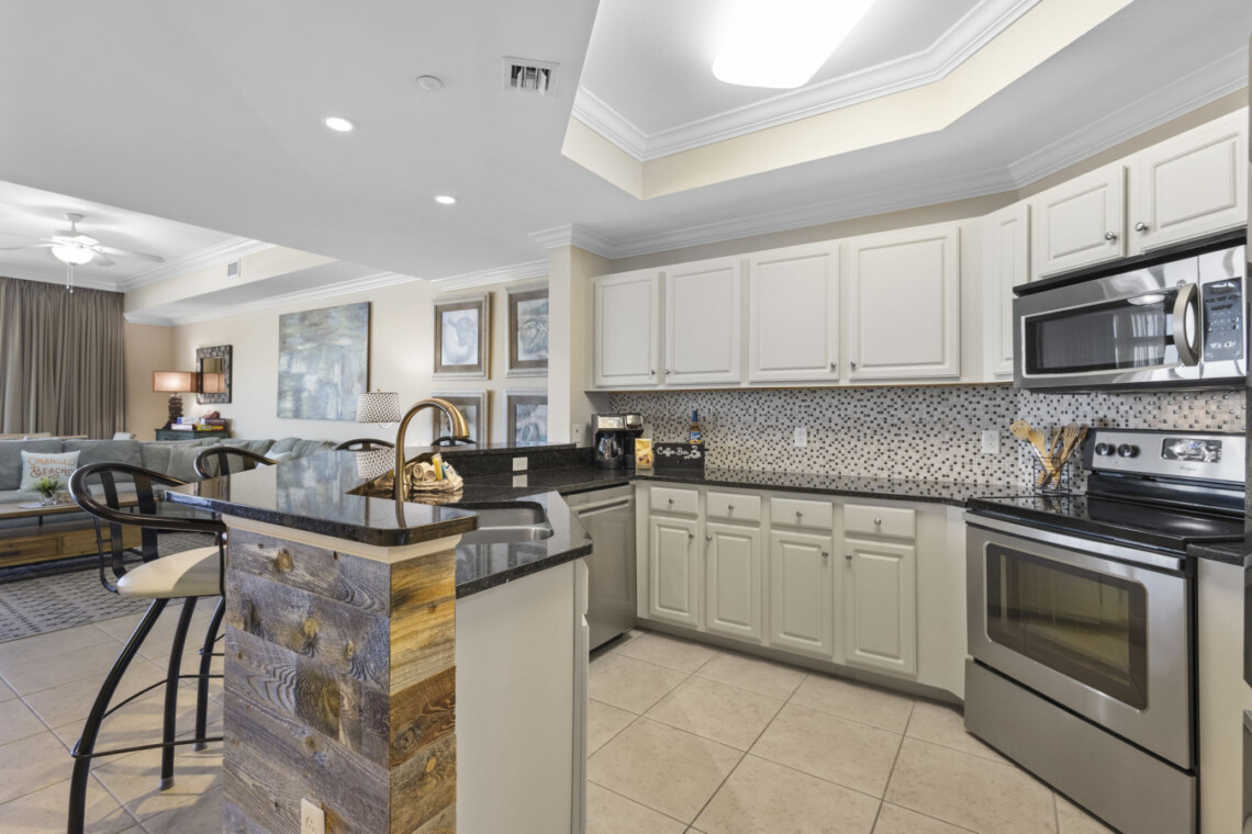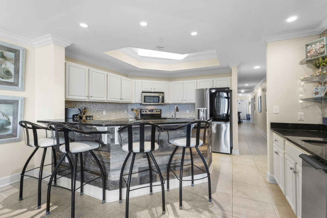 We’ve thought of every detail to ensure our guests of all ages have a memorable stay. For those seeking entertainment beyond the beach, our condo features a dedicated gaming and relaxation space. Unwind with a variety of classic board games, card games, and puzzles—perfect for cozy family game nights after a long day in the sand. The heart of the condo is its spacious and open living area. The fully equipped kitchen, with stainless steel appliances, ample counter space, and a high-top bar for is a dream for cooking or mixing up tropical cocktails.