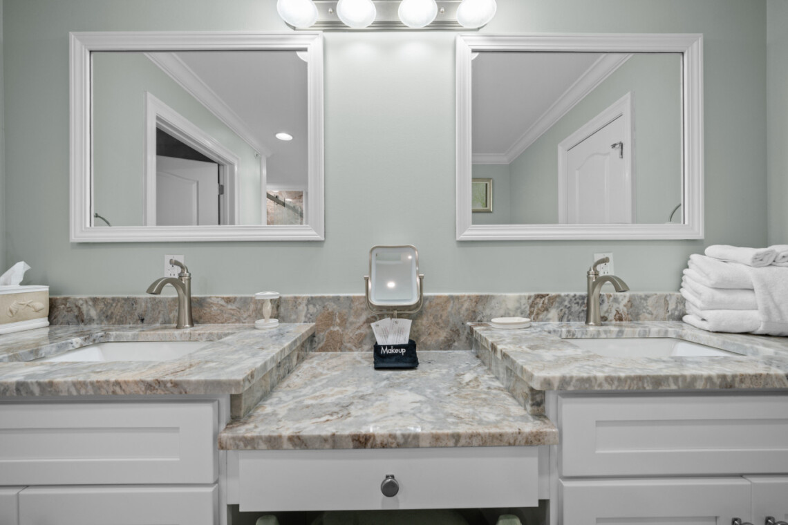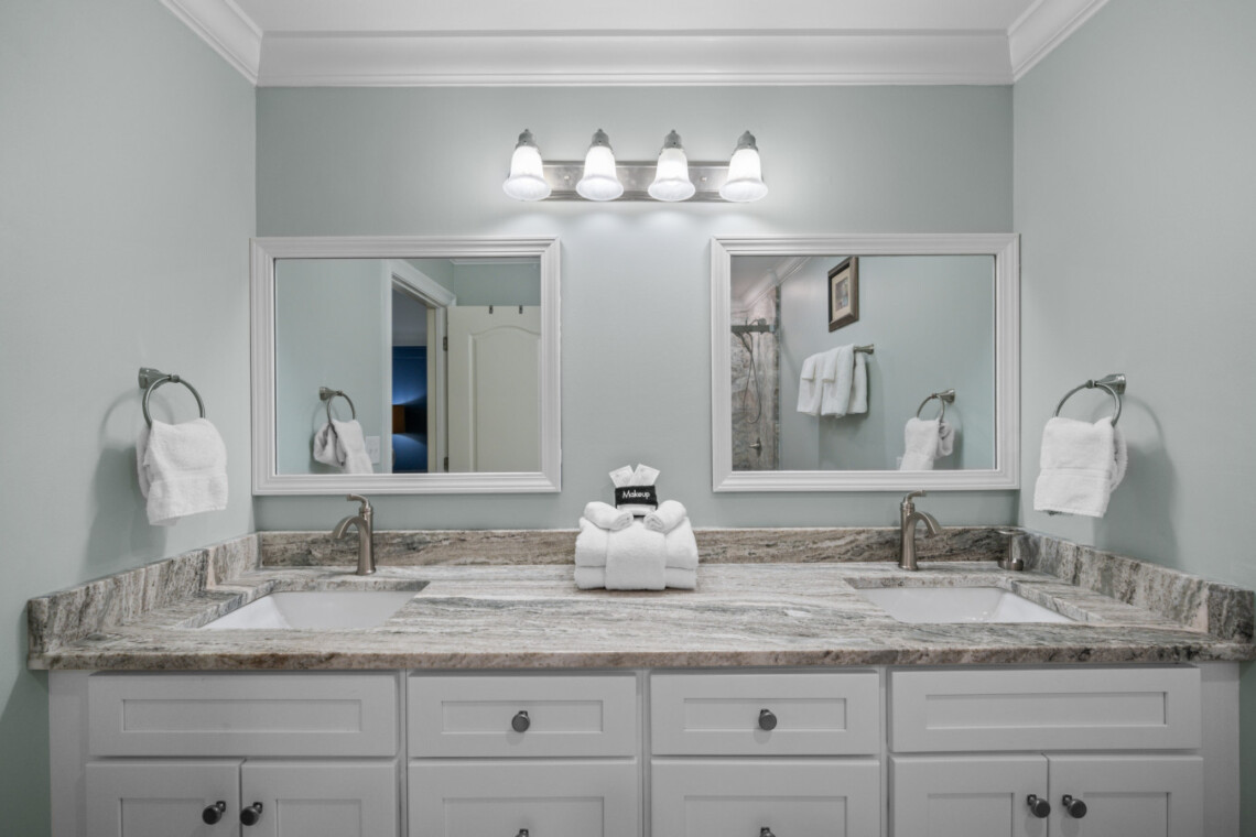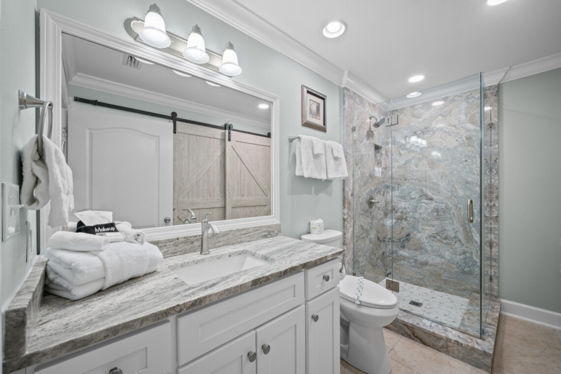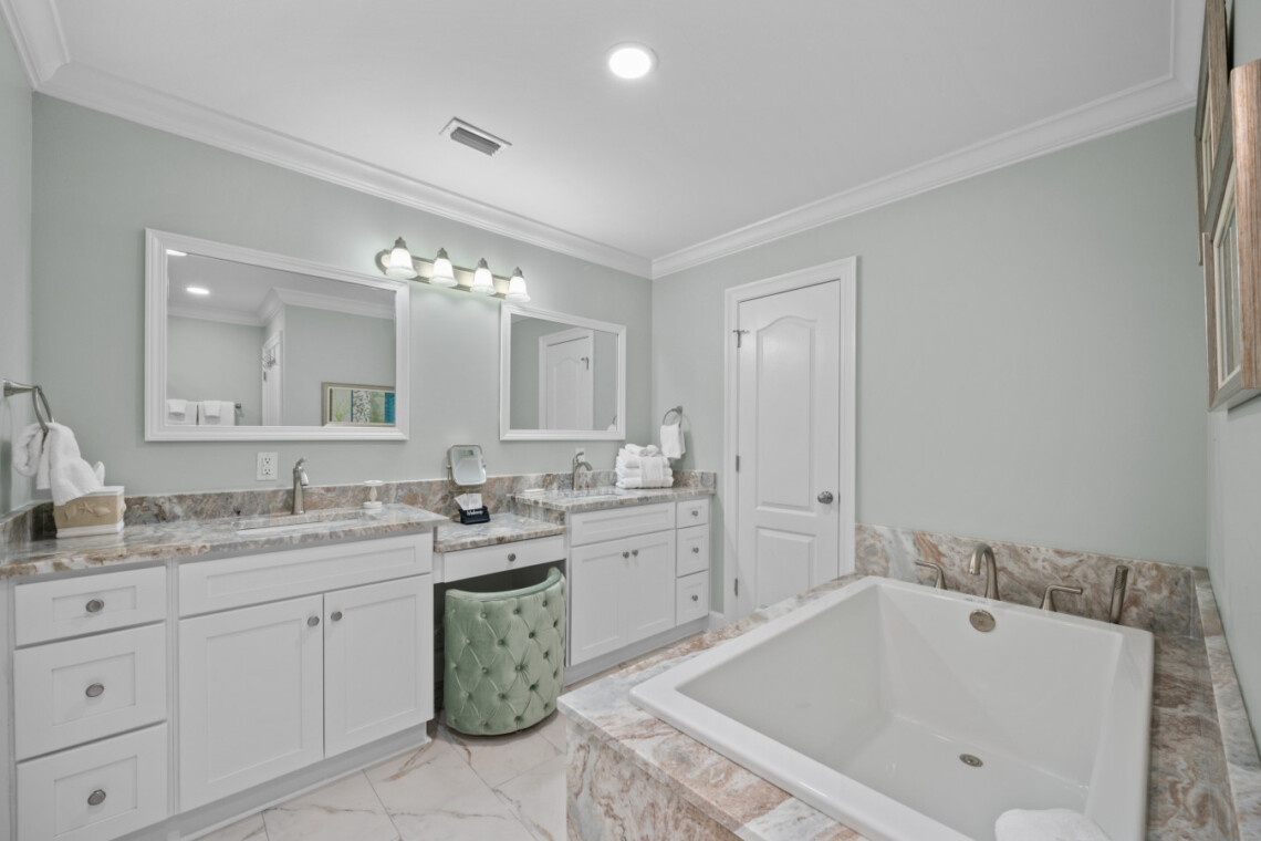 Rest easy in four stylishly appointed bedrooms, each offering beachy vibes and Smart TVs with cable. Featuring 2 master suites provide private, spa-like bathrooms, and since February 2025, you’ll be pampered with luxury upgrades: floor-to-ceiling tile, glass walk-in showers, double showerheads in the masters, and a deep soaking tub in the primary suite.